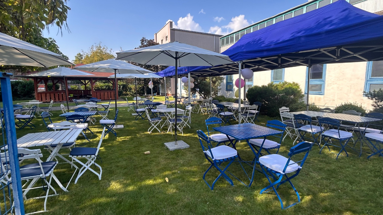 - kerti garnitúra fehér - kék ülőpárnákkal